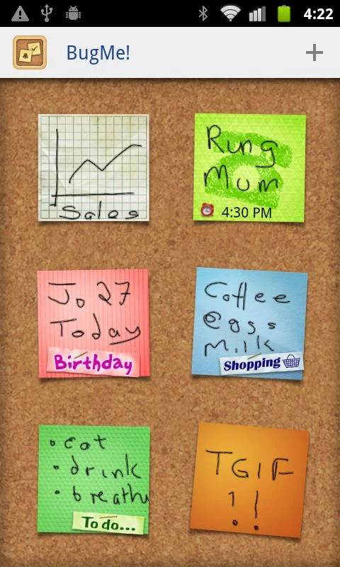 Bu tarih için sarı yapışkan notlar getirmek zamanı - BugMe! tüm eğlenceli ve akıllı telefon veya tablet sağ kullanışlı küçük notlar esneklik getiriyor. Uygulaması içinde sanal bir mantar pano onları pin ve alarmlar ve uyarılar ayarlayın veya BugMe kullanın! Bu ekstra görsel hatırlatma için başlatıcısı ekranda not 'sopa' için Widget!