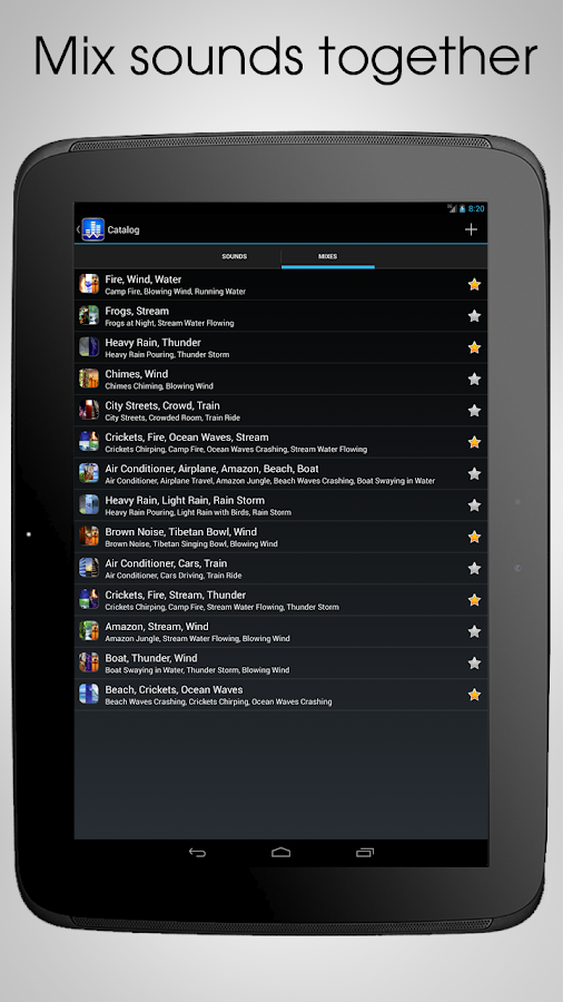 Klima, Uçak Seyahat, Amazon Jungle, rüzgar esiyor, Mavi Gürültü, Su Tekne sallanarak, Brown Gürültü, Camp Fire, Cars Driving, Kedi Purring, Çanları Chiming, City Streets, Kurutucu, Crickets cıvıl cıvıl, Kalabalık Odası, Çökme Sahil Dalgalar , Bulaşık Makinesi, Extreme Yağmur Dökme, Gece Kurbağalar, Büyükbaba Saat, Kuşlar, Heartbeat, Heavy Rain Dökme, Hafif Yağmur Üfleme Saç Kurutma Makinesi, Salınım Fan, Pembe Gürültü, Çökme Okyanus Dalgaları Araba Çatı, Yağmur Fırtına, Rain Shower Koşu , Su, Akan Çayı Su Koşu, Tibet Bowl, Train Ride, Süpürge, Mor Gürültü, Su Damlama, Su Yağmurlama, White Noise Singing Thunder Fırtına,